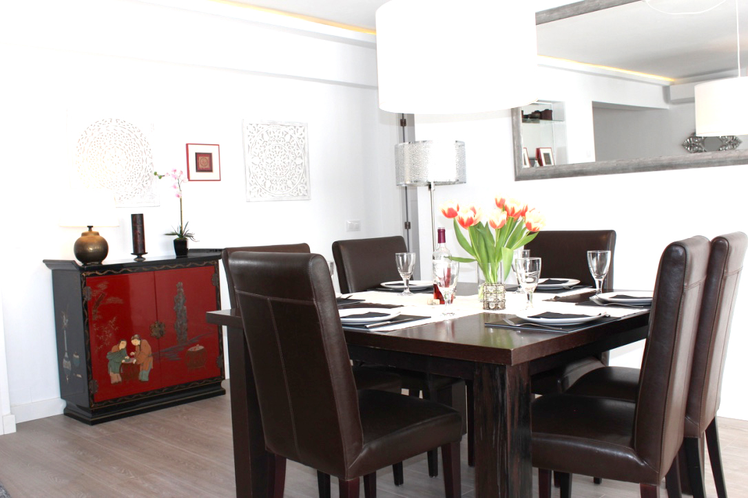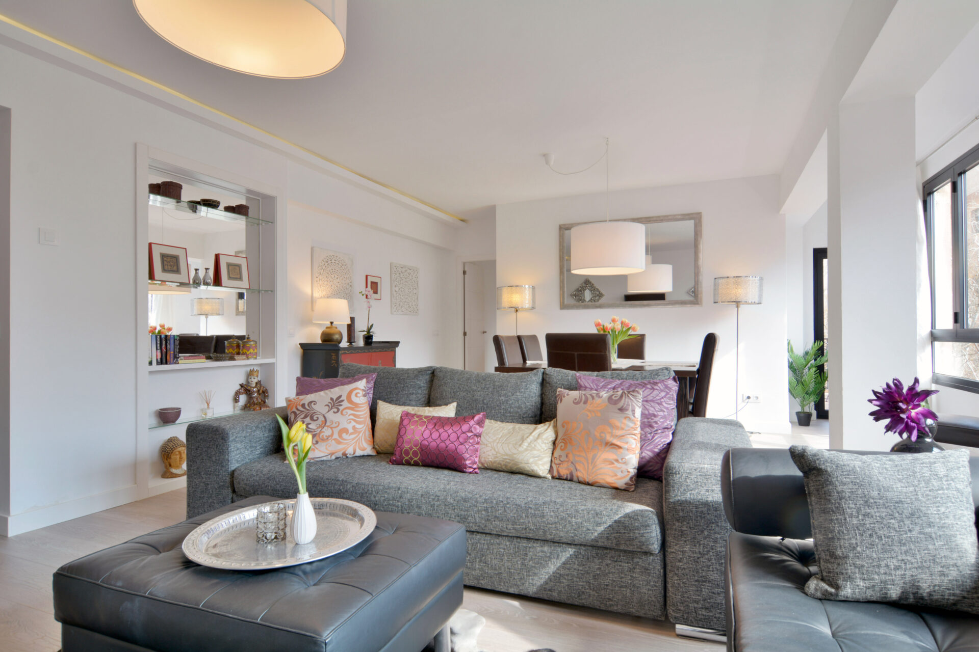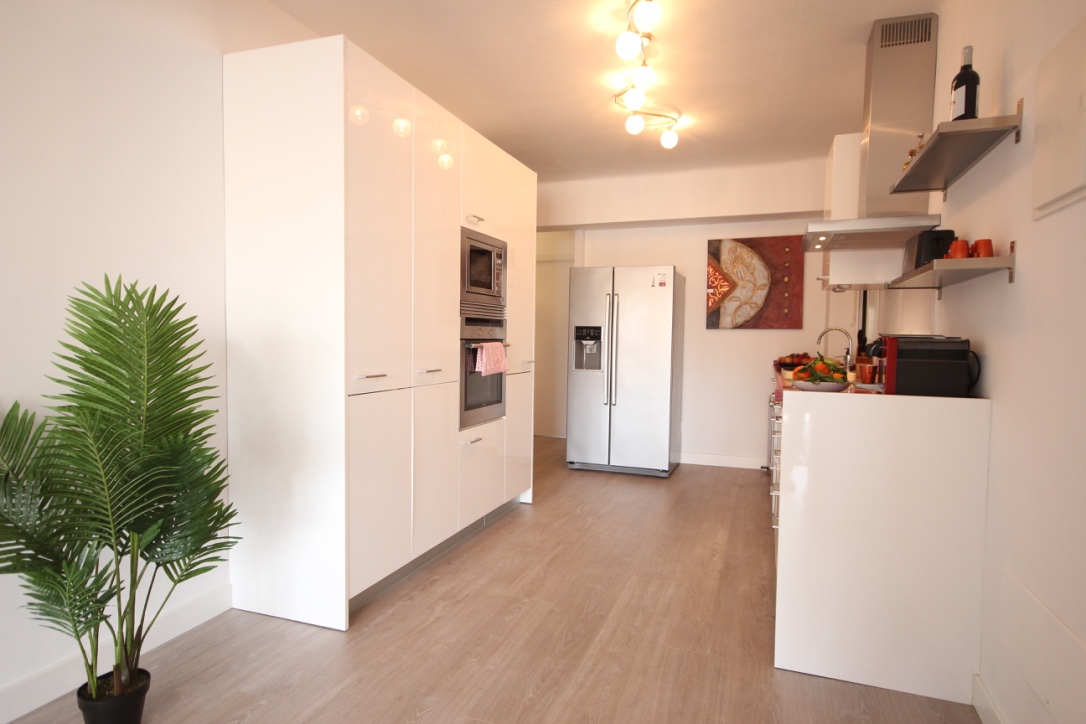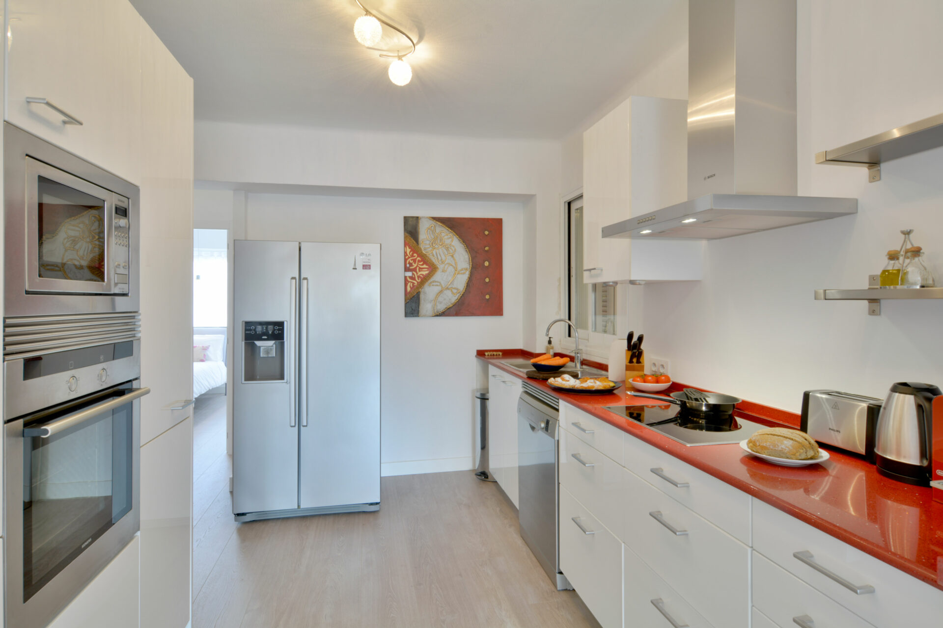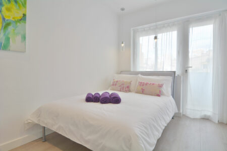 Upon entering the apartment, you’ll find a fully equipped contemporary kitchen which flows into a bright and inviting living room, featuring large, bright windows.