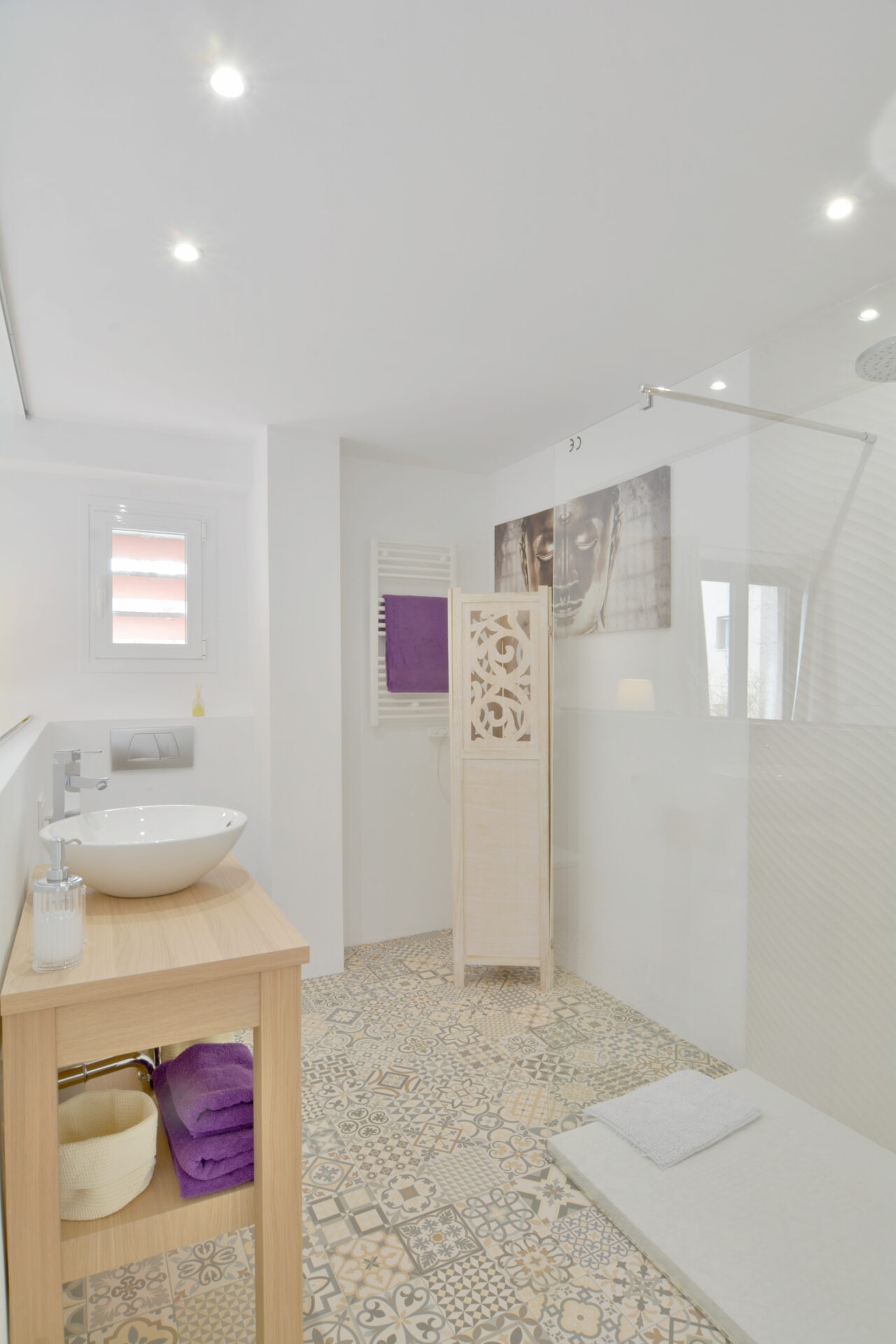 The apartment’s three bedrooms cater to various living needs. The main bedroom has a comfortable double bed and a private ensuite bathroom. The second bedroom features a cosy smaller double bed; (the access to the small outdoor laundry is from this bedroom), while the third is designed for versatility, offering bunk beds: the lower bed is a small double and the one above is a single. The second bathroom includes a modern shower.