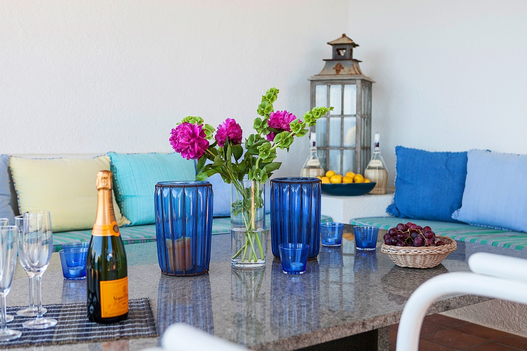 Designed for comfort and privacy, the villa can accommodate up to 8 guests. The main house features 4 bedrooms with ensuite bathrooms, a spacious lounge and a fully equipped kitchen. An adjoining wing, connected via a covered terrace, includes an additional bedroom with bathroom, plus a modern open-plan living and dining space with a fully opening glass façade leading onto the sun terrace – the perfect spot to work, relax, or simply enjoy the view.