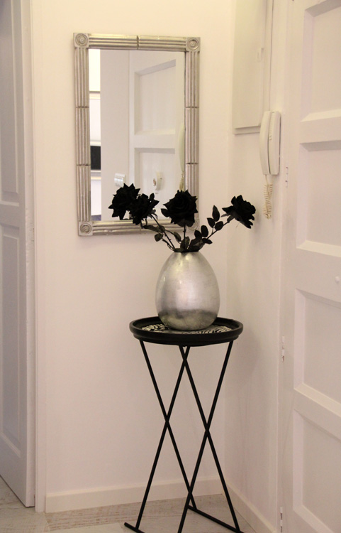 This apartment offers three furnished bedrooms, each with a wardrobe. The main bedroom is a true retreat, featuring a stunning black iron double bed, a matching bedside table, and a private ensuite bathroom. The second bedroom includes a comfortable double bed, while the third bedroom boasts two single beds, an ivory vanity, a wardrobe, and a charming small balcony.