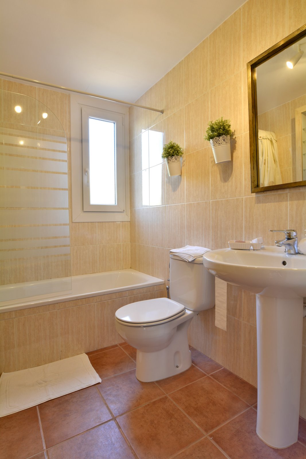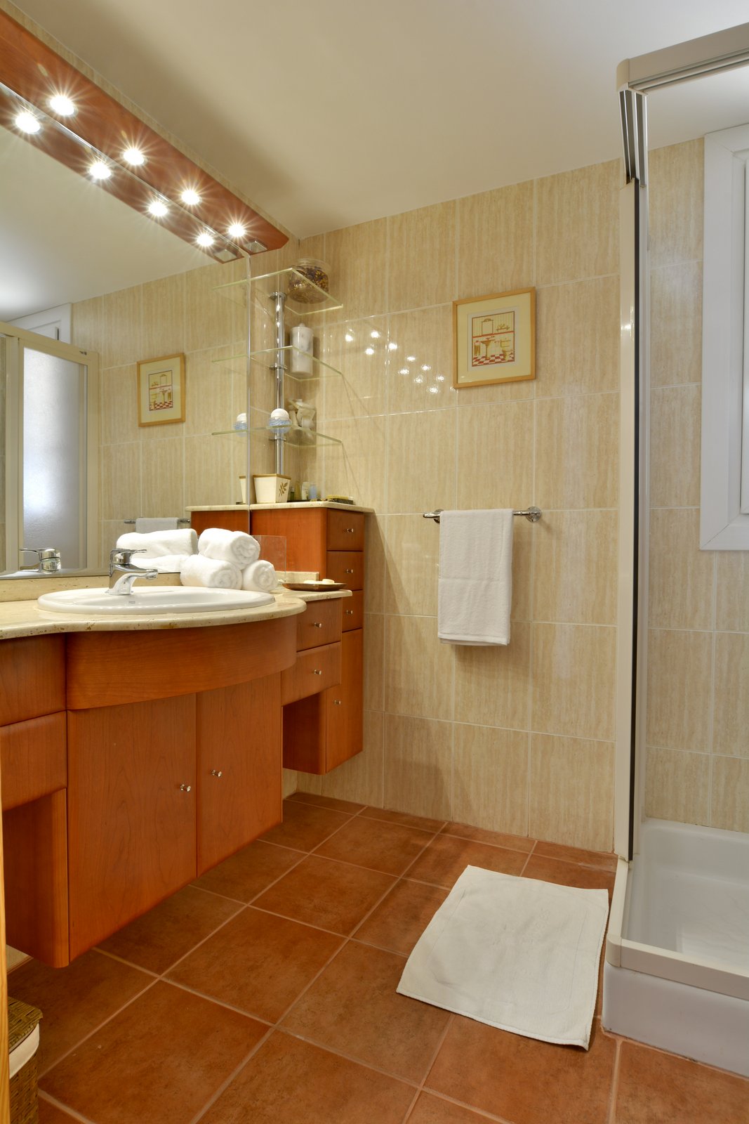 The apartment comprises three bedrooms and two bathrooms. Two bedrooms have a double bed and the third one has two single.