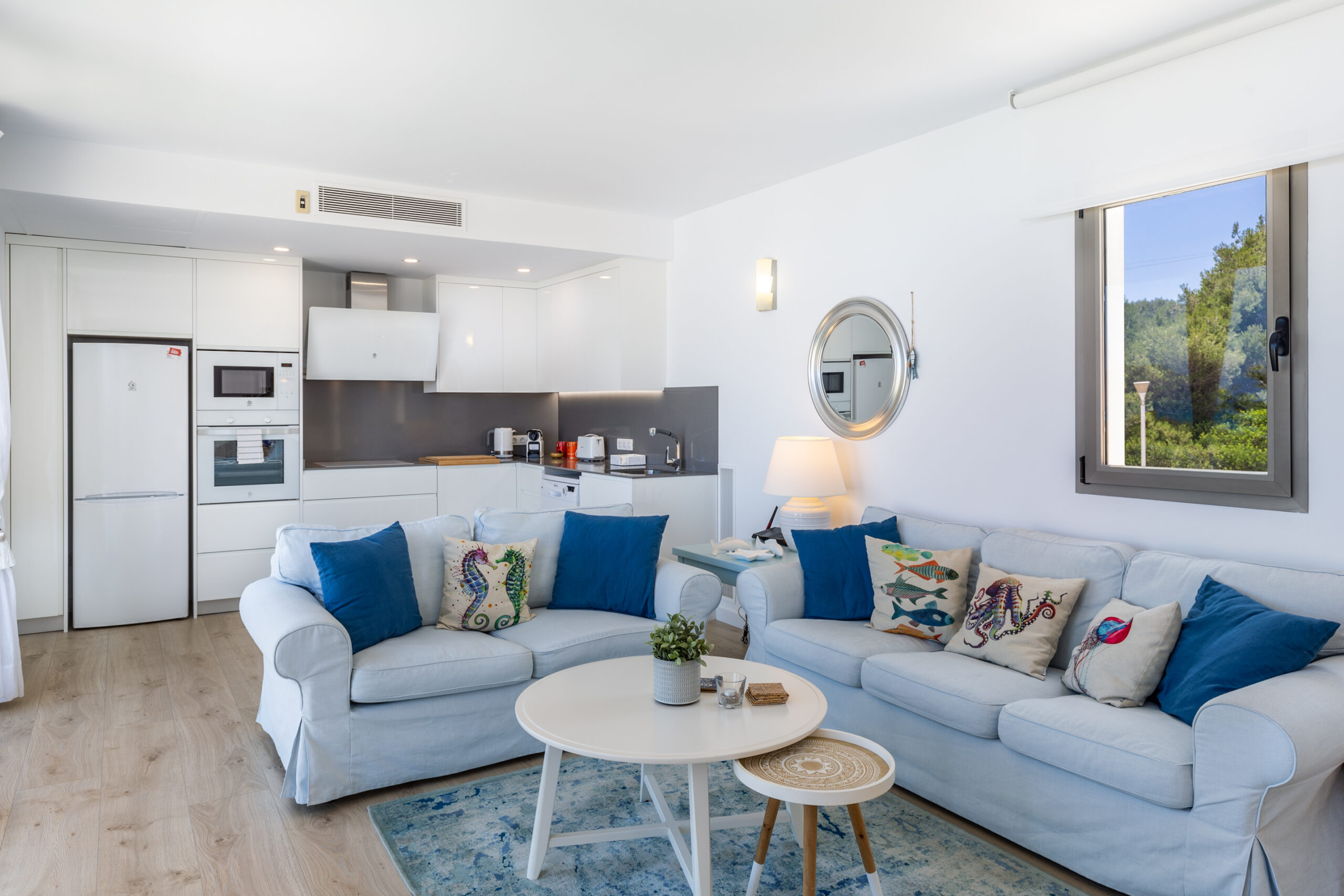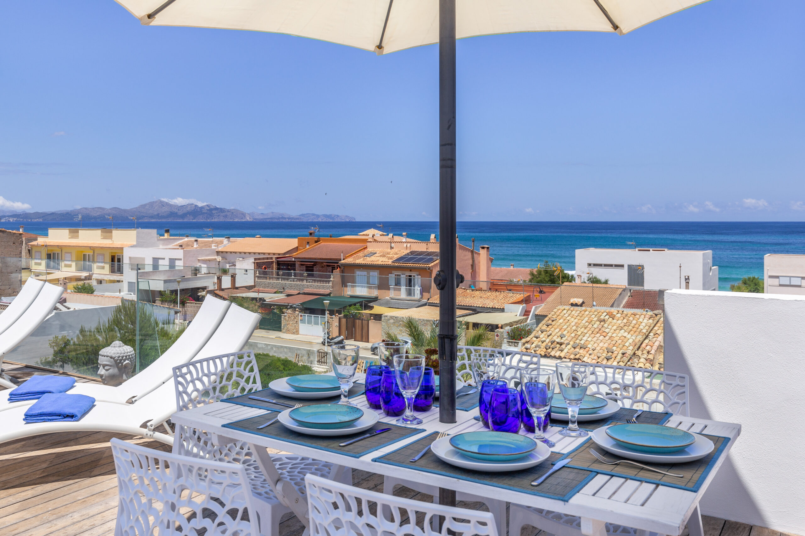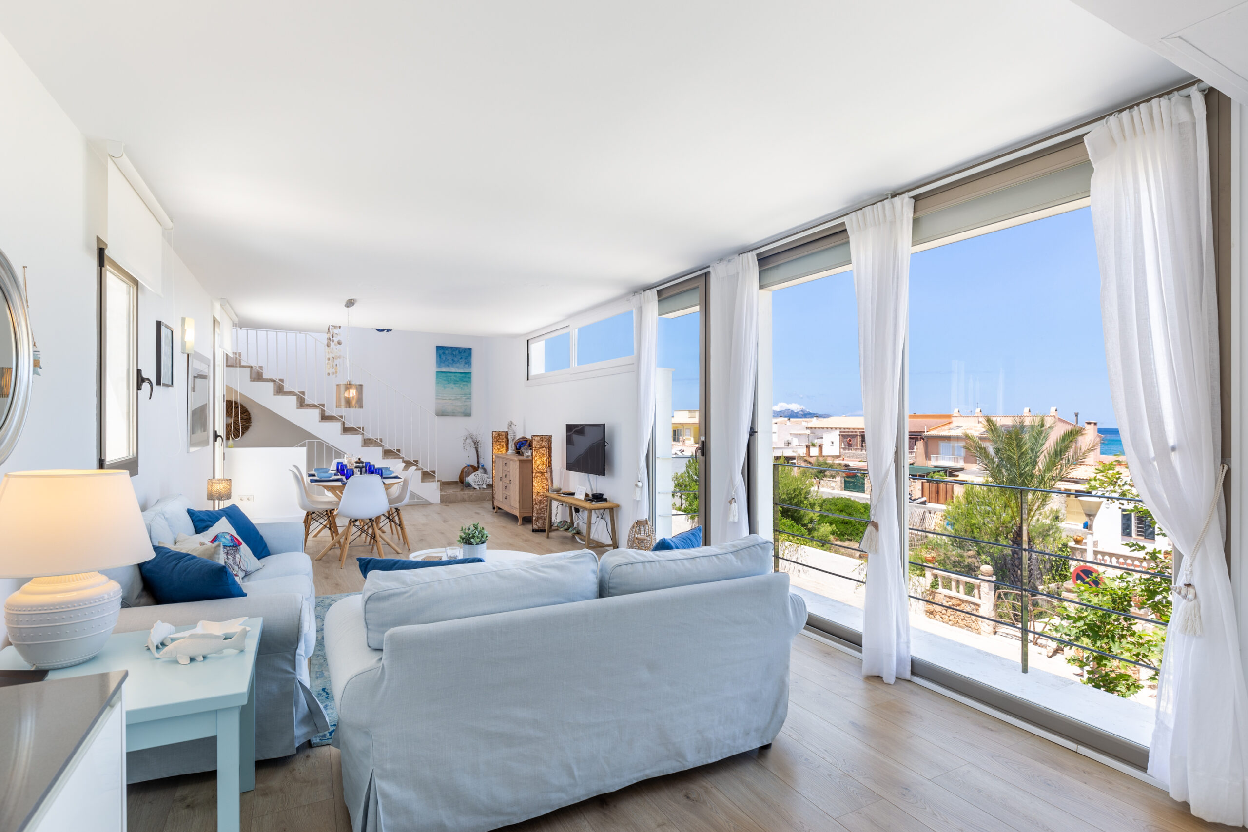 The first floor features an open-plan living area with kitchen, dining space and lounge, all designed to make the most of the panoramic views through its large windows. From the sofa, you can watch sailing yachts on Alcudia Bay or enjoy the ever-changing colours of the sea and mountains. There is also a guest toilet on this level.
