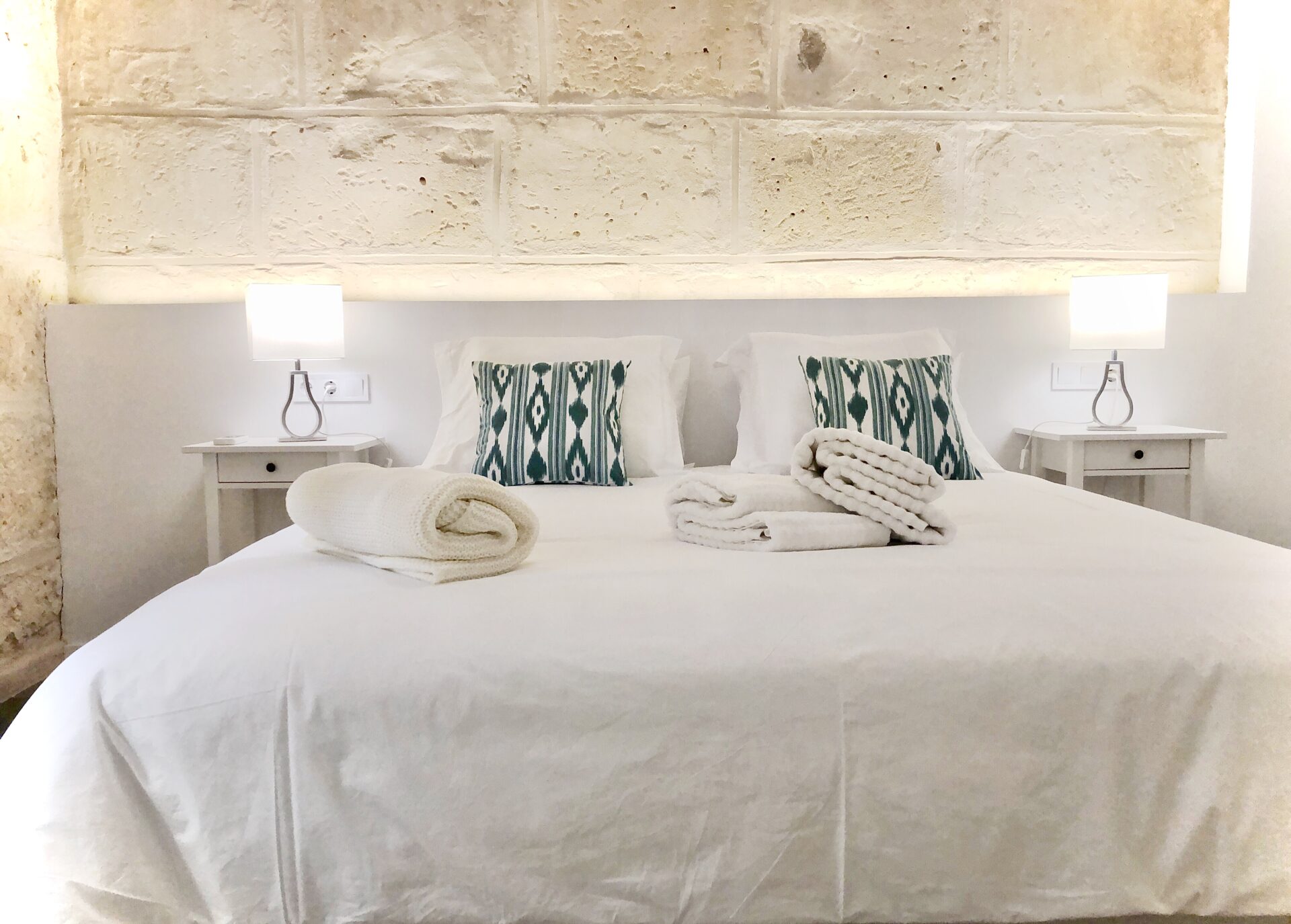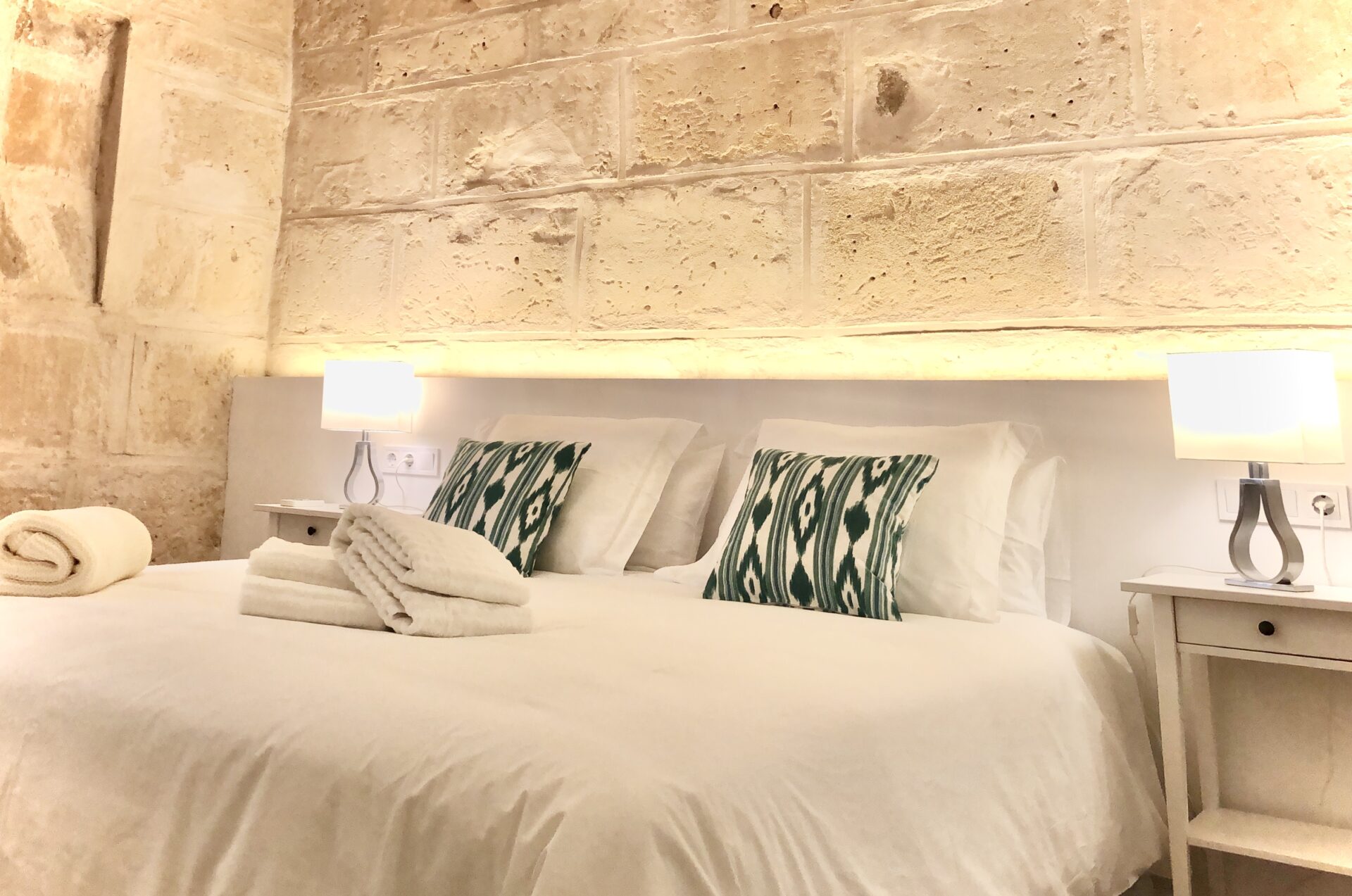 Both bedrooms are elegantly designed, each with a feature stone wall that complements the crisp white double beds, creating a tranquil and stylish environment. Each bedroom also has its own small balcony, offering a peaceful retreat. The two bathrooms are modern and practical, each with a walk-in shower for convenience.