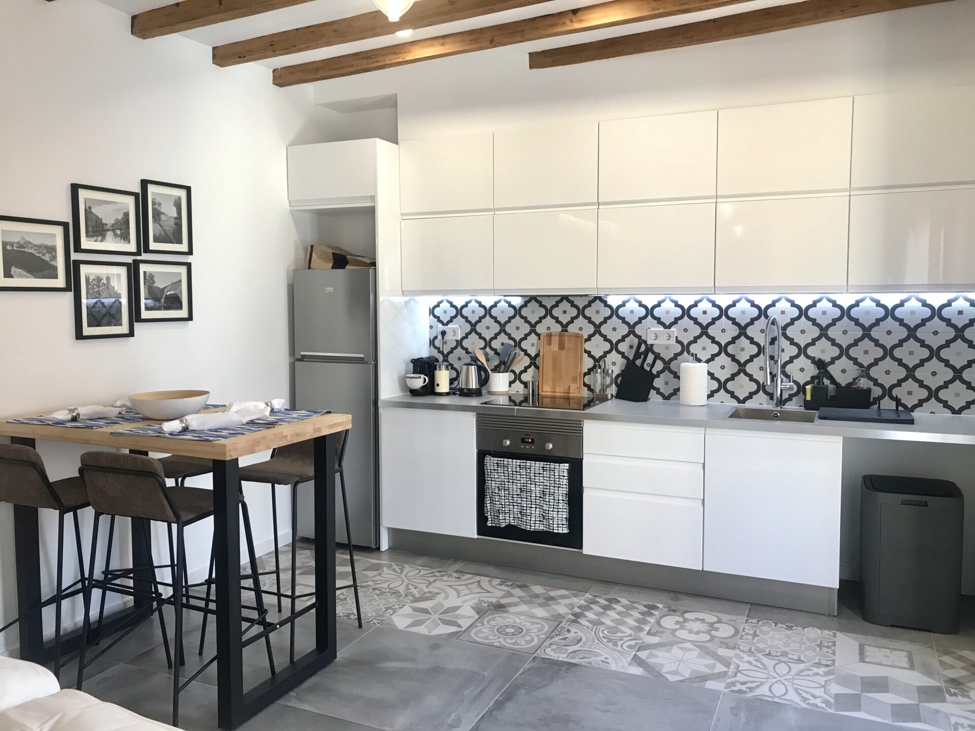 The open-concept living area includes a fully equipped kitchen and a tall, grey counter-height dining table, perfect for casual meals or entertaining. Air conditioning ensures comfort throughout the apartment, no matter the season.