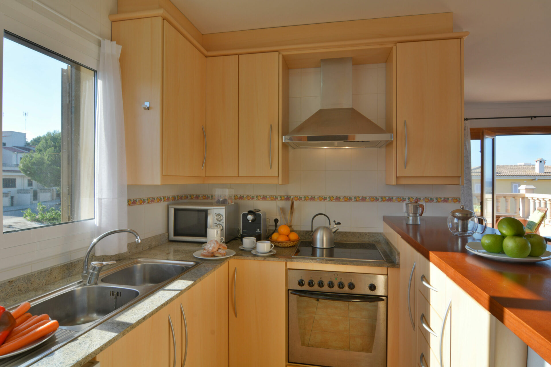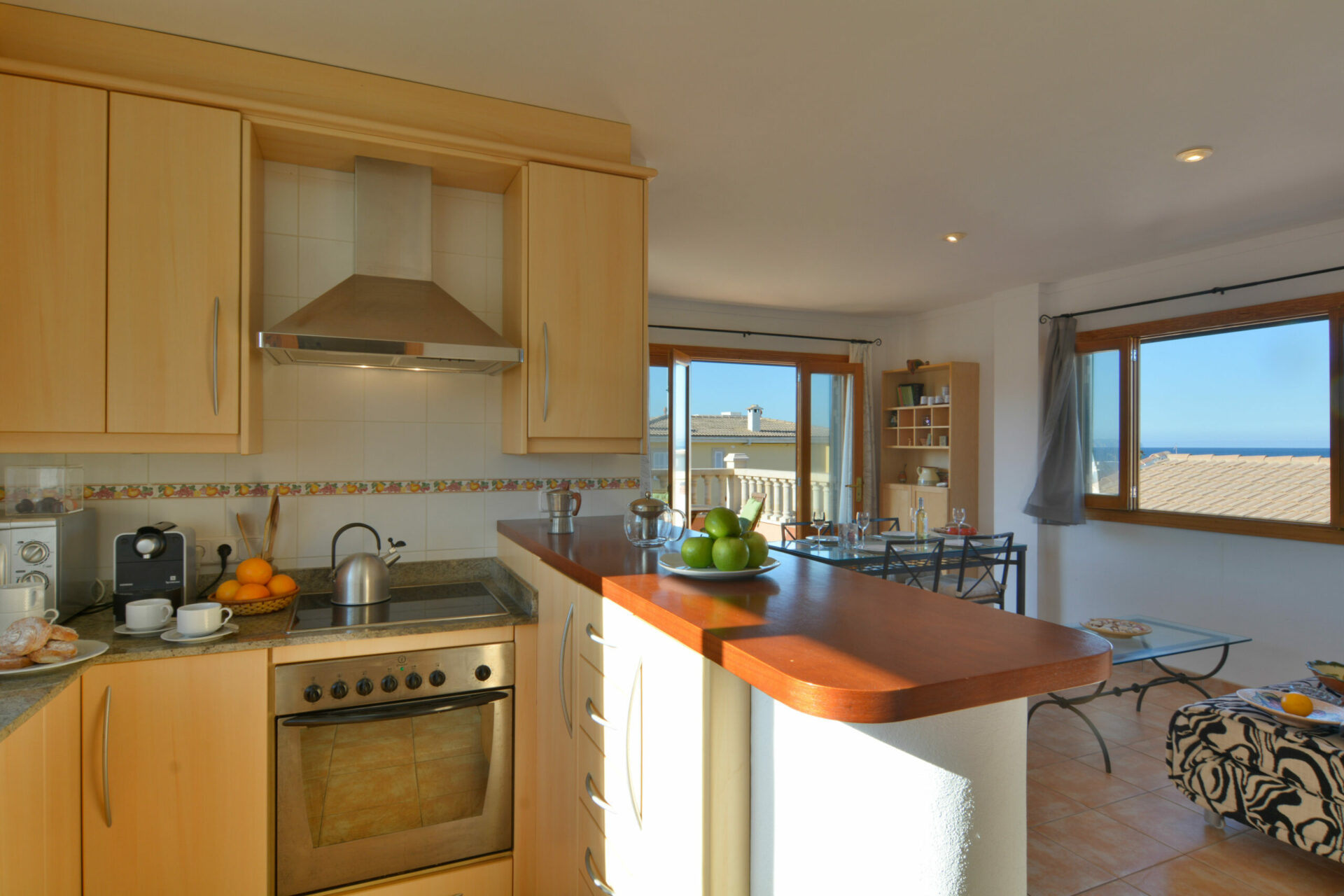 The living area is open plan, with a well-equipped kitchen, dining space and lounge that opens directly onto the private terrace. From here, you can enjoy beautiful views of the mountains and Alcudia Bay, and plenty of Mediterranean sunshine perfect for outdoor breakfasts, working al fresco or simply relaxing after a coastal walk.